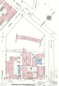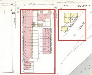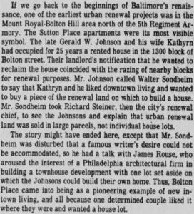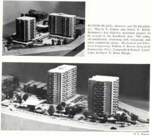The 300-apartment tower at 1111 Park Ave. was the first new housing project in Bolton Hill in the modern era, originally called Sutton Place. “The Sutton” – now known as “Renew Mt. Vernon” – sits east of Park Ave., immediately south of Dolphin Ln. (formerly known as Dolphin St. there), and this 1952 Sanborn map with added red boxes shows the houses and buildings previously occupying that space: