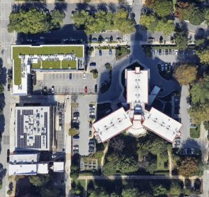 The 12-story tower has a three-pointed star footprint, seen in this Google maps image: