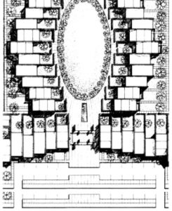 North of W. Lafayette, between Jordan St. and Mason St., sits Bolton Square, a group of 35 houses in staggered rows, designed by architect Hugh Newell Jacobsen and built by Stanley Panitz, clustered around a central green space.