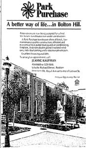 Plans for these 29 additional houses were approved by the city in July 1973 (over some objections from the Mt. Royal Improvement Association, related to parking and other elements). A May 1974 article, once construction was underway, noted the new architects involved were Peter D. Paul Associates. Of the courtyard in the center of the block, the article explained: “Park Purchase will include an elaborate landscape plan for the townhouses, featuring a park and plaza. The plaza will have a garden pool and fountain, with a wooden footbridge over the pool.”