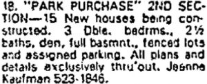 Another ad in September of that year described, “‘PARK PURCHASE’” 2ND SECTION—15 New houses being constructed. 3 Dble. Bedrms., 2½ baths, den, full basmnt., fenced lots and assigned parking.”