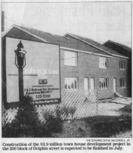 Ground was broken for the first seven red-roofed houses on the south side of W. Lafayette Ave. in August 1966 (i.e., 243-255 W. Lafayette Ave.). But a May 1966 Sun article had said the commitment to build the whole project at once had been “eased,” scaled back to building the project “in five stages.” It was reported this was mandated by the mortgage lender: “If the seven houses built in the first stage should not sell and Redevelopers was foreclosed, the bank’s liability would be less than if it were saddled with 43 unsalable houses.”