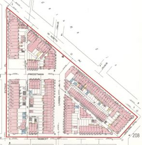 In the image below, this edited excerpt of the plat for the area south of Lafayette shows in green the seven houses previously built as Lafayette Close, and in orange are the next 29 houses – the first phase of the joint venture between Park Purchase Corp. and Atrium Inc. Morton Sarubin, who had developed the Beethoven Apartments, headed up Atrium, while Arthur L.S. Waxter Sr. led Park Purchase (hence his name now appears on a lane down near Dolphin St.) In the image, the bottom two rows of houses on Lanvale are just the top half of what’s commonly called the “Lion Park” today. The lower half of those weren’t built until later.
