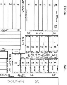 Bolton Place is a group of 16 houses – two connected rows and one freestanding home – opposite the Sutton on the west side of Park Ave., shown on this 1965 plat map: