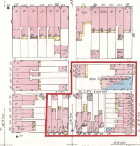 Prior to Bolton Place, this irregular plot of land had been the site of several houses and a church fronting on Park Ave., shown in this embellished excerpt of the 1952 Sanborn map: