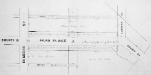 In July 1860, on condition that the city receive a deed for the land, an ordinance was passed “to close Grundy street, between McMechen and Laurens streets, and Foster alley from McMechen to Wilson streets, and Jenkins alley from McMechen to Laurens streets, as laid down upon the plat of the City.” Under that ordinance, the area was “to be called Park Place, and to be kept and preserved as a public park forever.” The ordinance provided that the median would be enclosed “with a good and substantial iron railing similar to that at Mount Vernon Place,” but not until “at least one-half of the aggregate front feet of both fronts on such square or squares, are improved with good and substantial houses.”
